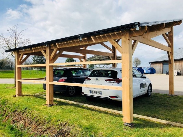 Auvent autoportant sur 4 poteaux de 3,00 ou 4,00m x 1,60m. Toiture composée de 3 ou 4 modules PV soit 1.5kW ou 2kW