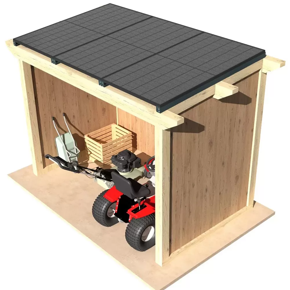 2 abris de jardins et 4 auvents monopente standards avec une toiture étanche en ALU composée de 3 à 8 panneaux photovoltaïques BOURGEOIS GLOBAL de 500W chacun, et du kit complet solaire (chemin de câbles, micro-onduleurs BG, connectiques, coffret AC, …). Le kit solaire est adapté en fonction de vos besoins et de puissance